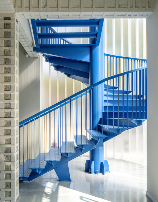 यू प्रोफाइल ग्लासपायऱ्यांवर वापरले जाते, जे आतील भागाला धुसर सौंदर्य देते. जरी जीर्ण आणि जर्जर असले तरी, मूळ काँक्रीटचा सर्पिल जिना नदीकाठच्या आणि रस्त्याच्या कोपऱ्यावर उभा होता, जो एका युगाच्या सामूहिक आठवणींना शिल्पकलेच्या स्थापनेप्रमाणे संकुचित करत होता. या आठवणींना पुनरुज्जीवित करताना वाहतूक प्रवाह सुव्यवस्थित करण्यासाठी, आम्ही त्याची रचना एका घरातील स्टीलच्या जिन्यामध्ये रूपांतरित केली, त्यावर "ECUST ब्लू" रंगाची ओळख निर्माण केली आणि त्याच्या बाहेरील बाजूस अर्ध-पारदर्शक, हलकी सीमा बांधली.यू प्रोफाइल ग्लास