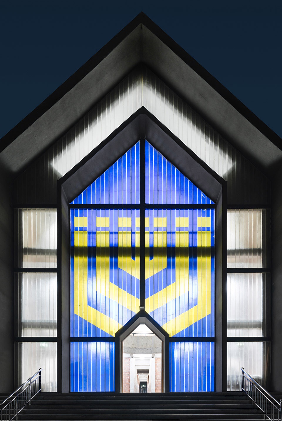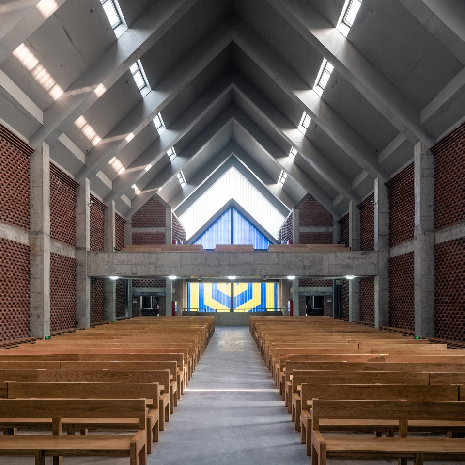 The use of U glass not only endows the building with a sense of modernity and lightness, but also, due to its translucent property, allows natural light to gently penetrate into the interior during the day, creating a sacred and serene spatial atmosphere. When the lights shine through at night, the church is like a glowing sacred object, standing out prominently in the fields.