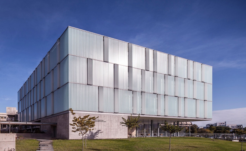 A double skin system serves as this section’s envelope, enabling the inner spaces to receive their appropriate exposure to sunlight. This façade consists of an internal glazed curtain wall and an external layer of green u glass, which is perforated by vertical openings of acid u glass louvers that expose the building’s population to the landscape.