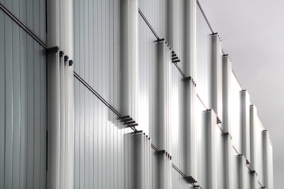 a double skin system serves as this section’s envelope, acid u glass louvers form vertical openings